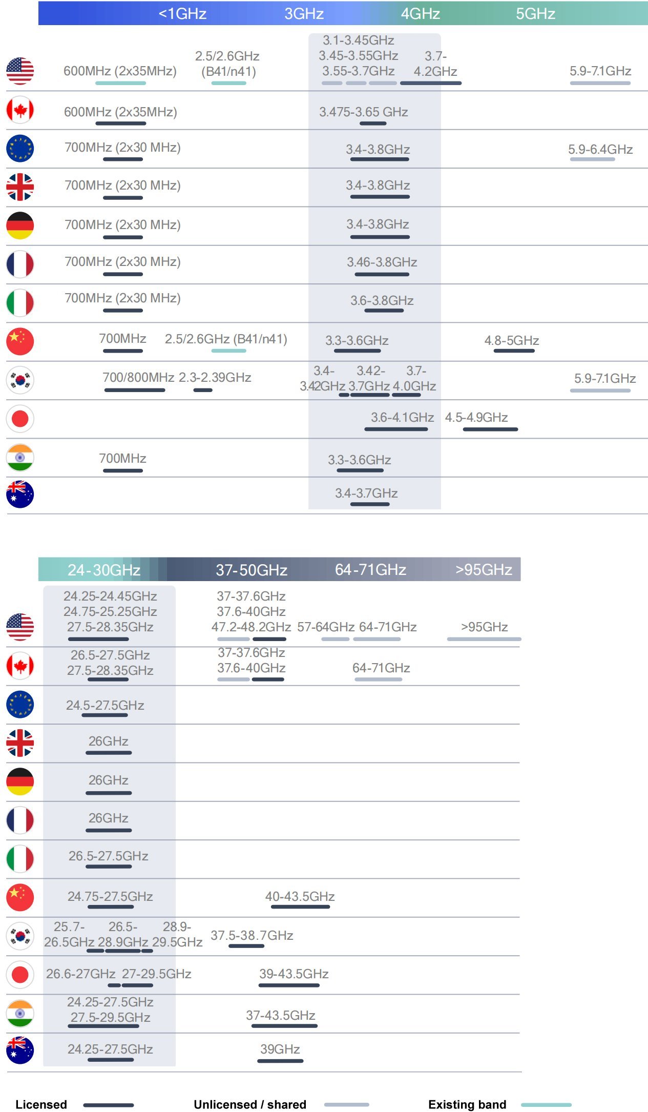 According to the GSMA’s recommendation, the service providers should deploy mmWave technology in 26 GHz, 40 GHz, 50 GHz, and 66 GHz for providing mobile services. However, some companies also consider the usage of 26 GHz and 28 GHz since they are already very suitable for operators and as they are adjacent bands, it will be easier for mobile devices to support them.