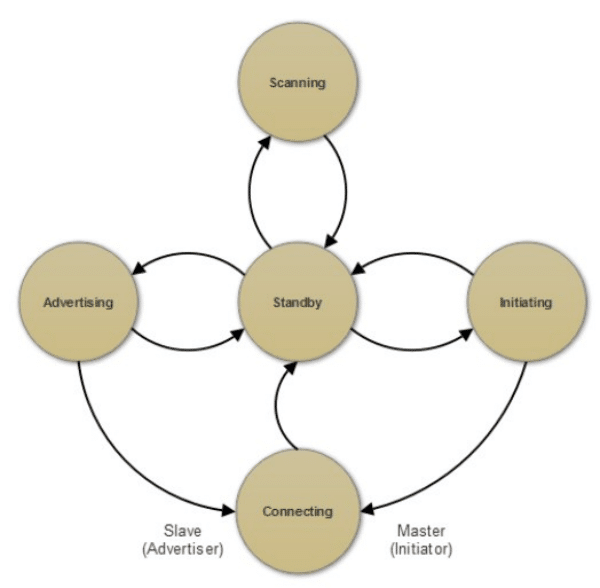 - Connected state: During this stage, a connection between the advertiser (slave) and the initiator (master) is set up. Now, the master can be seen as the central device while the slave is the peripheral device.